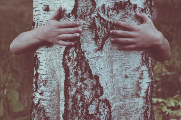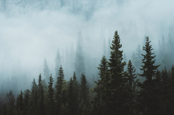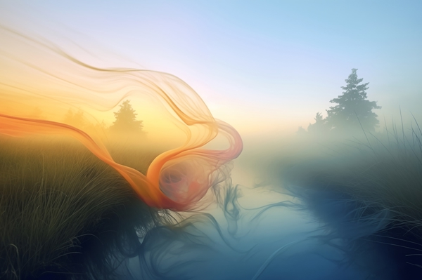 "Forest in autumn fog with a person jumping - surreal photo manipulation"