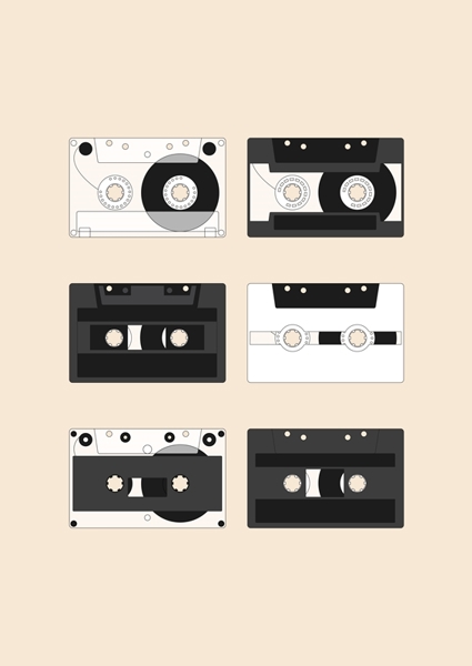 "Cassette Pattern #1" Poster von Kathrin May. Sechs Kassetten, sauber sortiert und doch voller Leben – auf einem zarten Pastellbeige, das fast wie eine Einladung zum Zurücklehnen wirkt. Die sanften Farbnuancen verleihen dem Retro-Motiv eine überraschende Ruhe, während das ständige Wiederholen der Tapes fast wie ein visueller Beat pulsiert. Hier trifft Vintage-Charme auf moderne Klarheit – perfekt, wenn du deinen Raum mit einem Hauch von entspannter Nostalgie und kreativem Flow füllen willst. Ein Mix für die Augen, der dich kurz in vergangene Zeiten katapultiert – ohne Kassettenrekorder, aber mit Style.