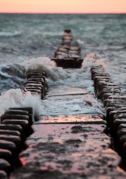 "Buhnen am Ostseestrand" Poster von Thomas Bugdoll. Wellen krachen gegen alte Holzpfähle, die sich wie eine stählerne Wirbelsäule ins Meer bohren – kalt, wild und irgendwie beruhigend. Die Ostsee zeigt hier ihr raues Gesicht, während das Licht der untergehenden Sonne die Szene in ein zartes Rosa taucht. Ein Moment, der zwischen Ruhe und Bewegung pendelt – fast so, als würde die Natur selbst den Takt angeben. Für alle, die das echte Küstenfeeling suchen, ist dieses Bild ein kleiner, aber feiner Kurzurlaub.