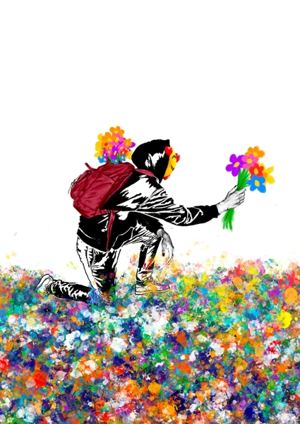 "Liebe und Freude" Poster von Boemo Hansen. Hier kniet jemand, vollgepackt mit einem Rucksack voller bunter Blumen – als ob Liebe und Freude das ultimative Gepäckstück sind. Die Farben explodieren regelrecht unten und geben dem Ganzen diesen „Kannst du nicht wegsehen“-Vibe. Dieses Kunstwerk aus Bergen bringt genau das rüber, was du brauchst: genug Positivität, um die Welt auszurichten. Also, warum nicht einfach mal Liebe verteilen, als wär’s das coolste Geschenk ever?