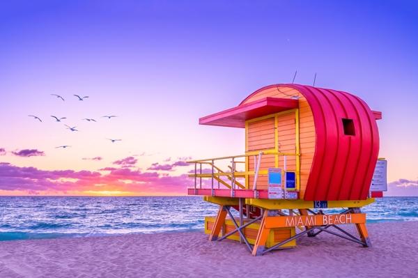 "colorful lifeguard hut at miami beach during sunrise, florida"