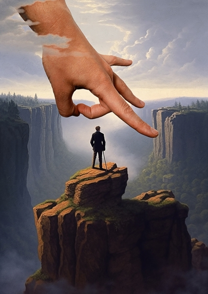 "A lone figure, on the brink of uncertainty, confronts a formidable force. The huge hand that descends menacingly from the sky symbolises the struggle against fate. A timeless reminder of the unshakable resilience of the human spirit or perhaps just a sadistic gag"