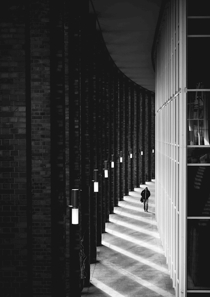 "auf einem Pfad" Poster von Cim Ek. Ein urbanes Labyrinth aus Licht und Schatten, das dich auf eine Reise durch Hamburgs Architektur mitnimmt. Die geschwungenen Linien der Wände und die rhythmisch gesetzten Laternen erzeugen einen Puls, der den Weg vorwärts treibt. Eine einzelne Gestalt – der Inbegriff von Entdeckung, fast verloren im Spiel von Schwarz und Weiß. Ein Stück für alle, die den Moment zwischen Struktur und Zufall lieben. Aber halt – hier steckt mehr drin als nur Treppensteigen.