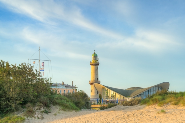 "View to the Warnemünde lighthouse and Teepott, a round building with three hyperbolic paraboloid shells as a roof. The building houses a restaurant and together with the lighthouse is one of the most famous sights of the Baltic resort Warnemünde."