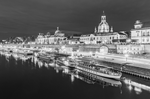 "Black and white photo city view with excursion steamer in front of Bruhl Terrace on the Elbe river, Academy of Arts and Frauenkirche church."