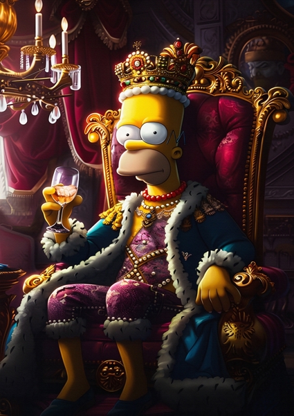 "Barocke Simpsons" Poster von ligon larry. Homer Simpson thront hier in königlicher Pracht, gekleidet in prunkvolle Barockgewänder, die mit funkelnden Juwelen besetzt sind. Der Thron, das edle Purpur und der funkelnde Kronleuchter im Hintergrund setzen einen dramatischen, fast schon absurd luxuriösen Akzent. Ein sarkastischer Mix aus Popkultur und barocker Opulenz – irgendwie absurd, aber genau das macht den Charme aus. Cheers, König Homer!