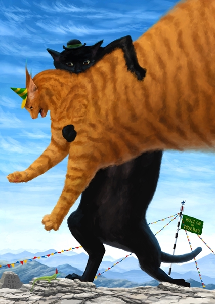 "Halte dich an deinem Bruder fest" Poster von Ciucinciu Tiberius. Zwei Katzen, die das Unmögliche möglich machen – der schwarze Kater hält seinen riesigen orangen Kumpel fest, während sie scheinbar vom Berggipfel davonfliegen. Die schräge Partyhüte-Paarung sorgt für den perfekten Meme-Moment, der Freundschaft auf eine ganz neue Stufe hebt. Dieses Kunstwerk verbindet Berge, Katzen und pure Verrücktheit – für alle, die wissen, dass man seinen Bro einfach niemals loslassen darf.