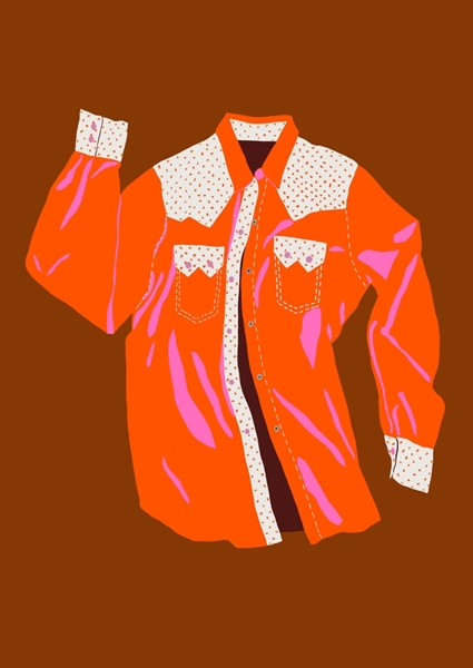 "Cowgirl" Poster von Astrid Lind. Diese knallige Cowboy-Bluse tanzt mit Orange und Pink auf einem satten Braun – Retro-Alarm deluxe! Die gepunkteten Details setzen charmante Akzente, die an Texas und Montana erinnern, ohne sich zu ernst zu nehmen. Ein echtes Statement für alle, die Western-Style lieben, aber nicht in der Zeit hängen bleiben wollen. Perfekt, wenn du Bock auf mehr Farbe und Charakter in deinem Kleiderschrank hast. Cowgirl-Vibes garantiert!