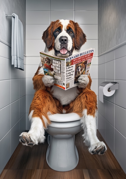 "Bernhardiner auf der Toilette" Poster von Craig Doogan. Dieser fluffige St. Bernard chillt auf dem stillen Örtchen und vertreibt sich die Zeit mit seiner eigenen Zeitung – The Bernard Bulletin, klar. Ein Bild, das auf humorvolle Weise zeigt, wie entspannte Hundepausen aussehen können. Zwischen Kacheln und Klopapier wird hier das Banale zum Highlight. Perfekt für alle, die Hunde lieben und dabei nicht auf eine Prise skurrilen Humor verzichten wollen. Badezimmerkunst mal anders – aber irgendwie auch genau richtig.