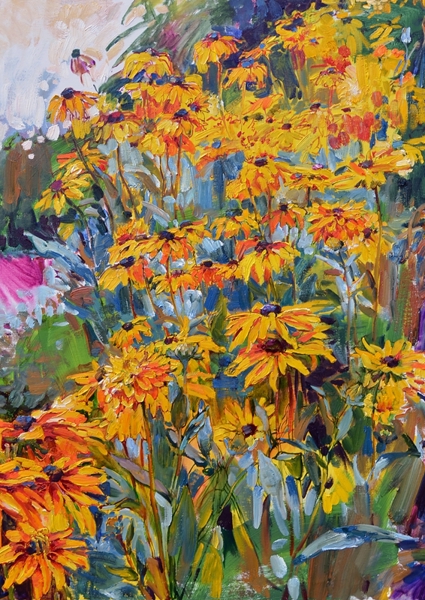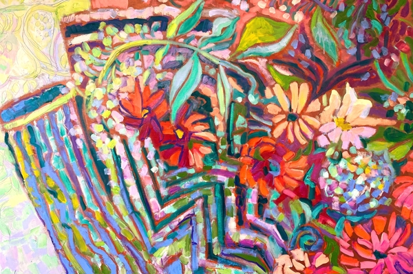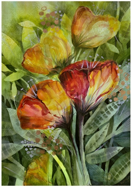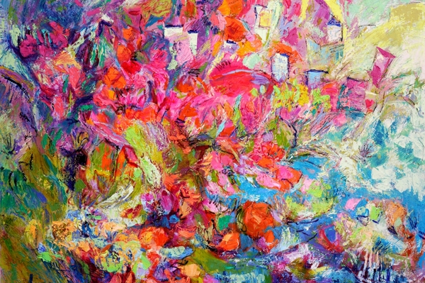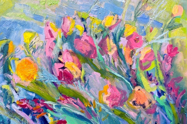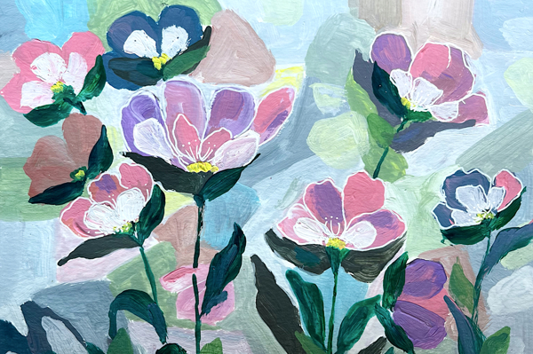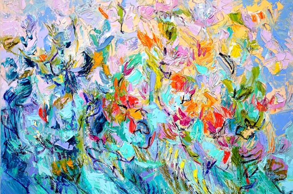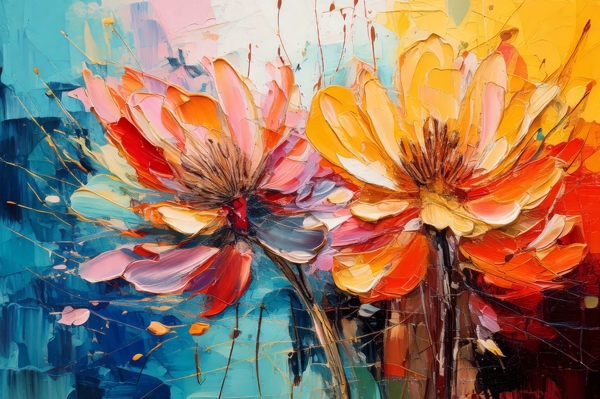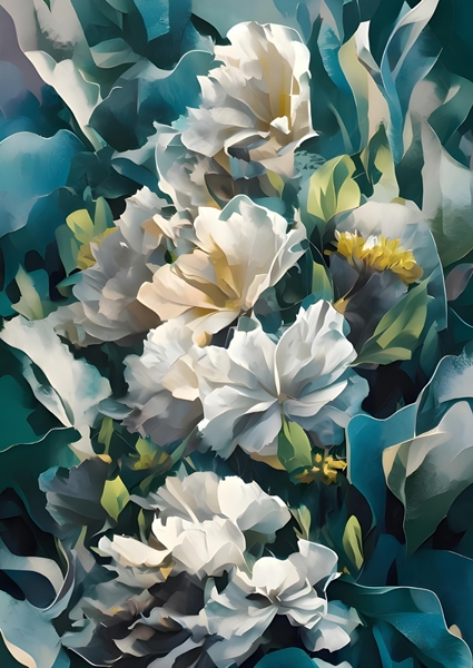 "This artwork captures the essence of spring through abstract floral forms, infused with warm hues and soft brushstrokes for a serene atmosphere. Its impressionistic style complements modern minimalistic interiors, enhancing spaces with a touch of nature's tranquility. Perfect for living rooms or art"