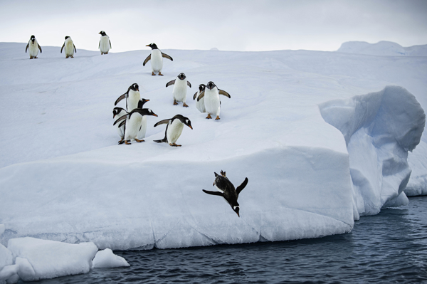 "Gentoo Penguins are lining up for taken a dive into the ocean from an iceberg. Neko Harbour, Antartica"