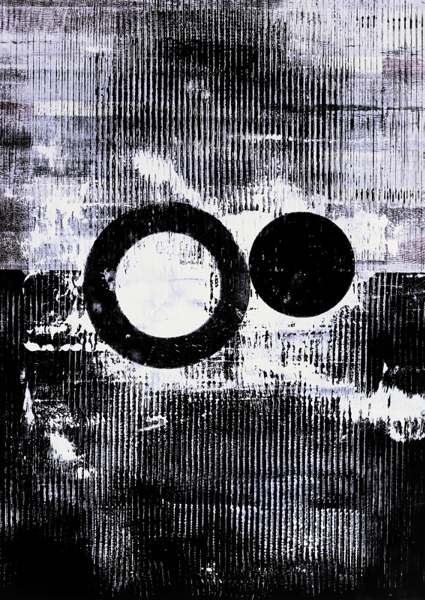 "This abstract artwork features bold geometric shapes with a monochrome palette. Textured layers and contrasting circles evoke a modern and dynamic feel, perfect for contemporary art enthusiasts seeking minimalist and innovative designs."