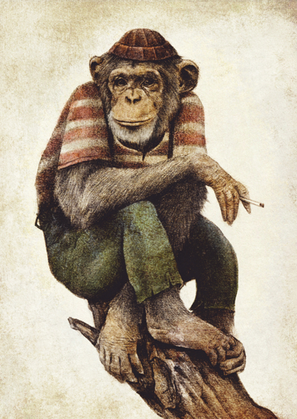 "This artwork features a chimp dressed in human clothing, seated with a cigarette. The piece combines humor and satire, exploring themes of anthropomorphism and lifestyle choices in a whimsical, vintage style. Perfect for pop art enthusiasts and collectors."