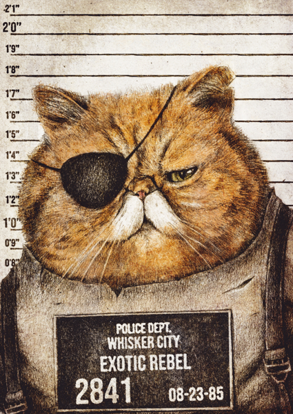 "This artwork features a grumpy cat with an eye patch in a humorous mugshot titled "Exotic Rebel" from Whisker City Police Dept. The quirky illustration adds a playful twist to feline portraiture, blending humor and art for cat lovers everywhere."