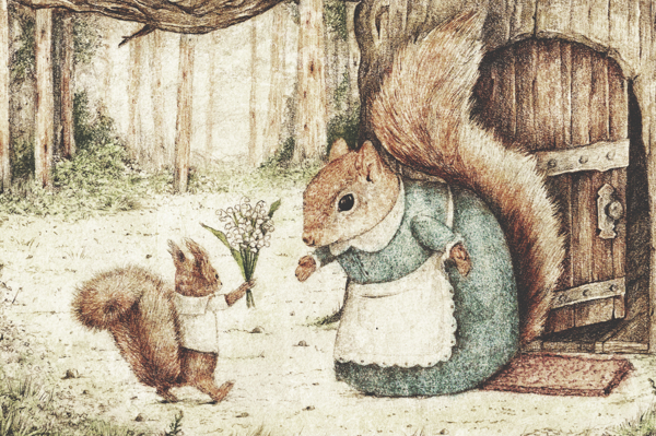 "This charming illustration depicts two anthropomorphic squirrels in a forest setting. One squirrel, dressed in a shirt, offers a bouquet to another squirrel in an apron. The artwork blends elements of fantasy, nature, and woodland creatures."