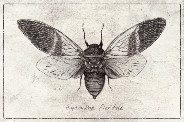 "Intricate cicada illustration featuring detailed ink work of Angamiana floridula. The monochrome sketch highlights the insect's delicate wing patterns and natural beauty, evoking vintage entomology art and botanical studies."