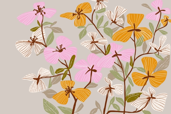 "This floral artwork features a botanical theme with pastel pink, orange, and white flowers against a muted background. The design showcases elegant leaves and stems, offering a harmonious and artistic depiction of nature suitable for decor and design inspiration."