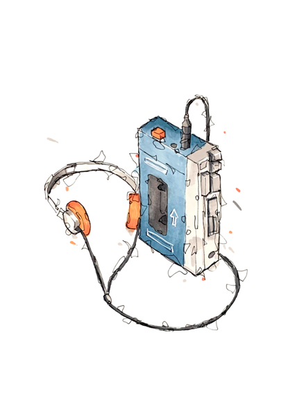 "Watercolor illustration of a vintage cassette player with headphones. Retro audio art evokes nostalgia, capturing the essence of classic portable music devices. Perfect for vintage tech enthusiasts and music lovers."