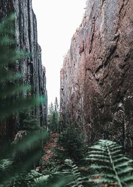 "Slåttdalsskrevan" Poster von Daniel Öberg. Zwischen diesen massiven Felswänden von Slåttdalsskrevan drängst du dich fast durch eine natürliche Schlucht, die Ruhe und Abenteuer zugleich verspricht. Die schroffen Steine erzählen Geschichten von Jahrtausenden, während das satte Grün der Farne und Bäume einen überraschenden Kontrast schafft – fast wie ein geheimer Zugang zu Norrlands ursprünglicher Wildnis. Hier spürt man die Kraft der Natur, ganz ohne Filter. Ein echtes Gefühl von „Höga Kusten“, das dich packt und nicht mehr loslässt.
