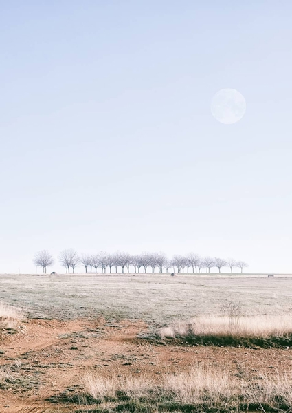 "Gefolgt vom Mond" Poster von Margarida Pinto. Ein endlos weiter Himmel, zartblau, fast zu sauber, um echt zu sein. Unten: eine Reihe kahler Bäume, wie stille Wächter, die auf etwas warten, während der bleiche Mond über ihnen schwebt – fast so, als hätte er gerade die Playlist gewechselt und chillt jetzt hier. Die Erde wirkt trocken, fast vergessen, aber irgendwie beruhigend – ein Ort, der sagt: „Atme mal durch, alles ist gut.“ Perfekt, wenn du einen Moment der Ruhe suchst, der nicht zu kitschig, sondern echt wirkt. Ein kleiner Ausflug nach Zamora, Spanien, ohne das Sofa zu verlassen.