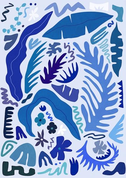 "Blauer Garten" Poster von amini54. Dieses Kunstwerk bringt botanische Elemente auf den Punkt – reduziert auf klare, mutige Formen in kühlen Blautönen. Palmen- und Blätter-Silhouetten tanzen wild durcheinander, als hätte die Natur beschlossen, sich minimalistisch und doch verspielt zu zeigen. Ein moderner Garten zum Abtauchen, der Ruhe und Frische versprüht, ohne sich zu ernst zu nehmen. Perfekt, wenn du Bock auf entspannten, tropischen Vibe hast, aber ohne das übliche Grünzeug-Drama.