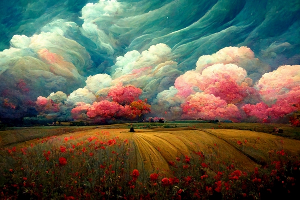 "Krajina v růžové barvě" poster od Winnie Møller. Nekonečný prostor plný dramatických oblaků, které se zdají jako vystřižené z jiného světa, nad polem plným červených máků. Barvy hrají divokou symfonii – od tajemně modrozelené oblohy po růžově explodující koruny stromů. Tenhle kus přírody je jakoby z jiného vesmíru, kde realita splývá s fantazií. Když se na to díváš, skoro cítíš vánek a slyšíš šumění trav, ale zároveň víš, že tu něco klame – příroda si dělá, co chce. Prostor, který tě vtáhne, a přitom nechá snít.