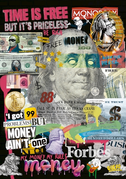 "99 Problémy" poster od ricardoquexo. Tahle koláž není jen o penězích, je to hlasitý křik finančního světa, kde „čas je zdarma, ale bezcenný není“. Ikonický Ben Franklin se tu míchá s Monopoly, bankovkami a všudypřítomným „Free Money“ – protože kdo by nechtěl? Všude narážky na bohatství, podnikání a tu věčnou dilema „99 problémů, ale prachy mezi nimi nejsou“. Energická, chaotická, skoro jako soundtrack dnešní doby, kdy finance diktují pravidla. Perfektní pro ty, kdo žijí rychle a nebojí se to ukázat.