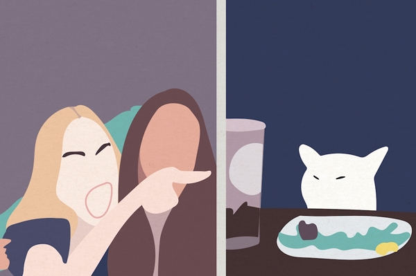 "Taylor A Rozmazat Kočičí Meme" poster od Emme. Digitální ilustrace zachycuje legendární moment z meme, kde dívka s úsměvem ukazuje prstem, zatímco bílá kočka Smudge sedí naproti s výrazem naprostého nezájmu a lehkého odsouzení. Kontrast emocí mezi nadšením a sarkasmem dělá scénu zábavnou a okamžitě rozpoznatelnou pro všechny internetové nadšence. Perfektní dárek nebo dekorace pro všechny, kdo milují popkulturu a humor, který nikdy neomrzí.
