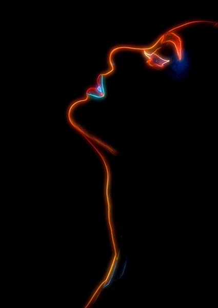 "Abstract artwork of woman in profile. Neon glowing outlines against deep black background. Dreamy"