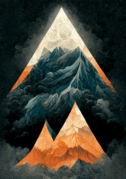 "Cesta osvícení" poster od Immersive Art. Obraz zobrazuje dva horské masivy zasazené do geometrických trojúhelníků, které vytvářejí fascinující kontrast mezi chladnými modrými tóny a teplými oranžovými odstíny. Temné pozadí s mlhavými obláčky dodává dílu tajemnou hloubku, která připomíná noční oblohu plnou nečekaných obrysů. „Way of Enlightenment“ není jen abstraktní krajina, ale výzva k objevování – jako kdyby hory samotné byly branou k něčemu většímu, skrytému za hranicemi běžného vnímání.