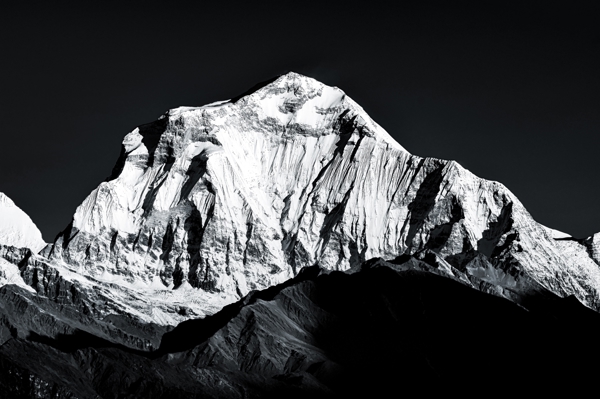 "Dhaulagiri" poster od Holger Weigelt. Ostré hrany, ledové tvary a kontrasty černé a bílé jako z filmu noir – to je Dhaulagiri, sedmá nejvyšší hora světa, která tu stojí jako ztělesněná síla Himalájí. Snímek zachycuje každý záhyb skály, každou vrstvu ledu, která odolává času i lidským snahám. Je to výzva pro dobrodruhy, ale i pro snílky, kteří chtějí pocítit dech Nepálu přímo z pohodlí domova. Když se díváš, skoro slyšíš vítr.
