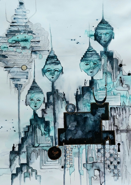 "Buddhův vrch" poster od Ieva Rudzite. Akvarelová kompozice, kde se abstrakce setkává s meditativní atmosférou. Plující tváře buddhovitých postav vyvěrají z geometrických struktur jako strážci dávné moudrosti. Studené tóny modré a černé splývají v surrealistickou krajinu, která balansuje mezi snem a realitou. „Buddha Hill“ vtahuje do klidné, přesto tajemné dimenze, ideální pro prostor, který hledá hloubku a trochu té podprahové magie. Tak trochu jako kdyby Dalí potkal moderní meditaci.