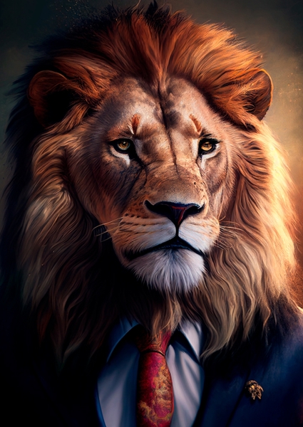 "Lion wearing a suit, created in AI and colored in Photoshop."