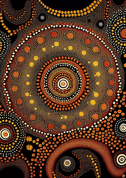 "Denna digitala målning visar cirklar i en aboriginsk stil, med färger som främst är orange röda. Cirklarna är målade med kraftfulla, slående linjer och mönster som visar de traditionella teknikerna och motiven i indigen australisk konst. Användningen av varma orange-röda färger ger verket en känsla av sammanhang med den naturliga miljön och livskraft. Cirklarna är symboliska i många indigena kulturer och kan representera många saker som livscykeln, kopplingen mellan det andliga och det fysiska världen och kopplingen mellan människor och marken. Penselströken är lösa och uttrycksfulla, vilket ger målningen en känsla av rörelse och energi. Detta verk är perfekt för dem som uppskattar indigen konst och vill ta med sig en bit av kulturellt arv hem eller kontor."