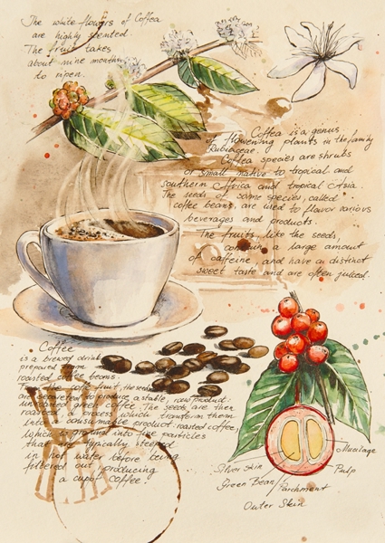 "The morning coffee drinking ritual inspired me to paint this watercolor. What a long road must the coffee bean go before it goes to my cup ... Nature provides many inspirations. Thanks to it, the series "From botanist's notebook" was created. Please visit my gallery for more botanical illustrations."