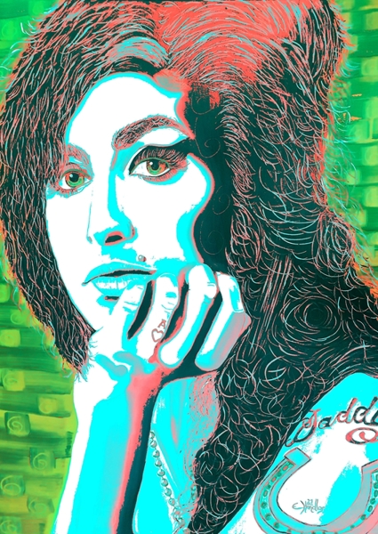 "Emy Winehouse" poster od Erich Handlos. Tahle Emy Winehouse je jako výbuch barev a emocí, který nečekáš. Zelené pozadí pulzuje energií, zatímco její výraz je plný melancholie a hloubky – ta kombinace nostalgie a současnosti, co tě prostě chytne za srdce. Detaily jako tetování „Daddy’s Girl“ připomínají její příběh, tenhle obraz není jen portrét, ale malý popkulturní manifest. Moderní pojetí legendy, co si zaslouží být viděno.