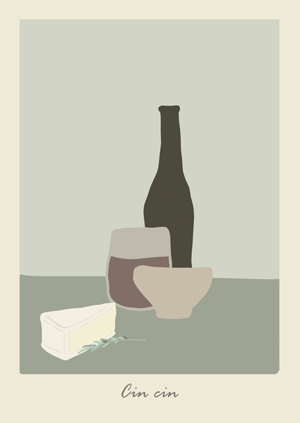 "Sýry a víno" poster od Julia Hellerstedt. Minimalistická ilustrace zachycuje jednoduchou eleganci – láhev vína, sklenici s tmavým nápojem, mělkou misku a kousek sýra na tlumeném pozadí v odstínech greige a béžové. Vše působí jako tichý přípitek všedního dne, který si zaslouží pozornost. Ideální dekorace do kuchyně či jídelny, kde oceníte stylový, ale nenucený šmrnc. Tenhle print umí pozvednout atmosféru bez zbytečné okázalosti. Cin cin!