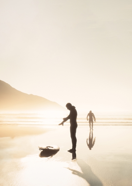 "Míříme do vln" poster od Henrik Sjöberg. Sluneční paprsky hladí pobřeží, zatímco dvě siluety surferů se připravují na vlny. Jeden z nich kontroluje prkno, druhý kráčí po pláži, všechno to zní jako soundtrack klidného rána v Norsku. Ta mlha v pozadí? Přidává tomu trochu té mystiky a zároveň pocit, že čas zpomalil. Ideální moment zachycený v zlaté hodině – pro všechny, kdo milují vodu, sport a tu speciální atmosféru před prvním záběrem na vlnu. On the way to the waves, fakt.