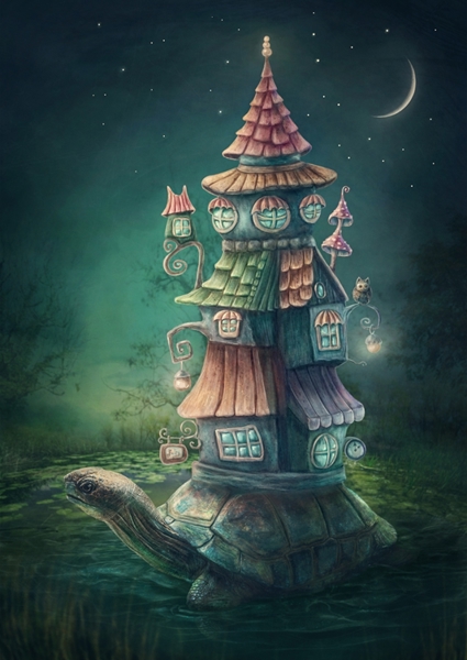 "Želva se svým domem" poster od Elena Schweitzer. Krásná želva pomalu kráčí noční krajinou a na svých zádech nese dům, který by mohl mít klidně vlastní PSČ. Každé okénko a střechu zdobí hravé detaily, co působí skoro jako z pohádky nebo fantasy seriálu. Všude kolem blikají hvězdy a měsíc jen tiše přihlíží, jak se tahle kouzelná plazí loď vydává na tichou, magickou cestu. Ideální obraz pro milovníky snění a dobrodružství, kteří vědí, že domov nemusí být jen místo – může být i cesta.