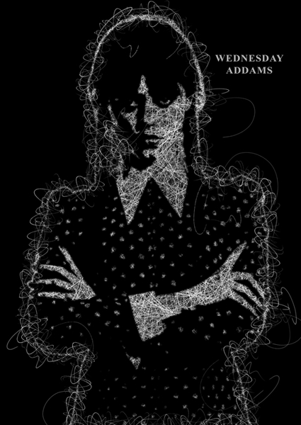 "STŘEDA ADDAMSOVÁ" poster od Last Art. Detailní linie vytvářejí postavu Wednesday Addams v její typické póze s překříženýma rukama a chladným výrazem, který proniká temnotou. Černobílá paleta podtrhuje její gotickou povahu, zatímco chaotické, spletité tahy působí jako vizuální šepot jejího tajemného světa. Tohle není jen portrét – je to pozvánka do temné elegance Addamsovy rodiny, která si hraje s hranicí mezi hrůzou a humorem. Ideální doplněk pro fanoušky kultovního goth stylu.