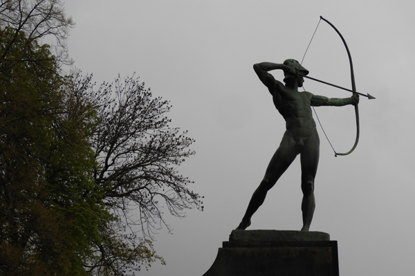 "An einem regnerischen, grauen Tag habe ich diese Schattenriss des bekannten Bogenschützen zusammen mit Bäumen aufgenommen. Auf den ersten Blick wirkt das Foto wie eine schwarz/weiß Aufnahme, es sind jedoch Grüntöne der Patina am Bogenschützen und den Blättern der Bäume zu erkennen."