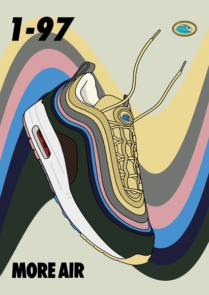"vzduch létat barevné" poster od Hypesign. Barevný Air Max 97 vystupuje z plochy a okamžitě chytá za oko. Kombinace béžové, modré, růžové a černé vytváří retro-vibes, které připomínají streetwearové klasiky, a přitom působí svěže a moderně. Tenhle kousek není jen o botě, ale o životním stylu – „More Air“ tady znamená víc než jen vzduch v podrážce, je to výkřik pro všechny sneakerheady, co milují hype a kulturu města. Vizuál dýchá energií, jako kdybys slyšel beat v pozadí.