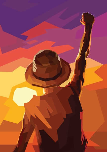 "Luffy Ve Vektorové Umění " poster od Sulton Hanafi. Vektorové umění zachycuje postavu s kloboukem, která vztyčuje pěst směrem k zapadajícímu slunci. Geometrické tvary a ostré barevné bloky v teplých odstínech oranžové, červené a fialové vytvářejí energický a dynamický efekt. Silueta vyzařuje odhodlání a dobrodružství, připomíná ikonické anime a pirátské příběhy. Tento digitální plakát je perfektní volbou pro fanoušky výrazného, barevného a současného umění do každého prostoru.