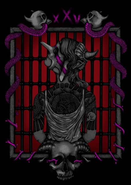"Temné vězení no25" poster od Taufiq Aqil. Temná, silně texturovaná ilustrace ženy uvězněné za mřížemi. Její tělo je pokryté tetováním a obklopeno hady, kteří se vinou kolem mříží i lebky v popředí. Fialové a černé tóny kontrastují s krvavě rudým pozadím, což vytváří hypnotickou atmosféru pasti a vnitřního boje. Symbolika rohů, lebek a hadů mluví o uvěznění – fyzickém i duševním. Pro milovníky temného, syrového umění s nádechem mystiky.