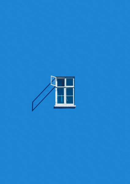 "Bouillononaire" poster od Meanwhile In Nowhere. Minimalistické okno visí na sytě modrém pozadí jako malý světlý bod ve vesmíru. Otevřený rám zve slunce dovnitř a vrhá dlouhý, ostrý stín, který dodává obrazu hloubku a trochu tajemství. Je to jakoby chvíle zastavená v čase – jednoduchost a architektonický detail v jednom. Pro všechny, kdo milují čistotu minimalismu a rádoby nekonečnou modř.