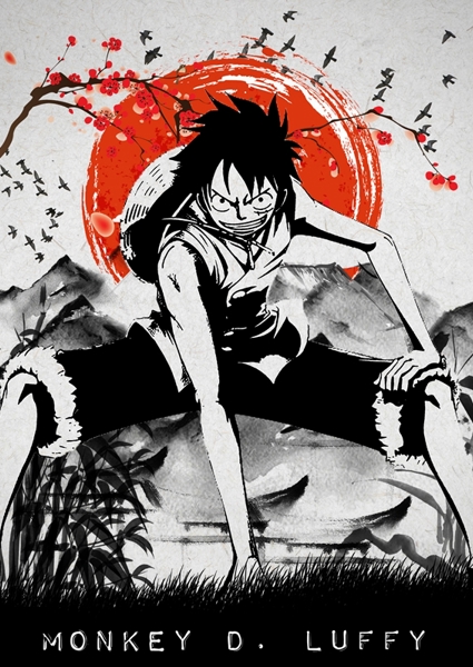 "Opice D. Luffy" poster od Jaya Berkah. Tahle ilustrace Monkey D. Luffyho je čistá síla v černobílé, která exploduje do života díky ohnivému červenému slunci v pozadí. Tenhle pirát z One Piece stojí pevně na zemi, připravený na cokoli – a kolem něj se rozlévá atmosféra napjaté akce s jemnými větvičkami a ptáky v letu. Klasický manga styl se tu potkává s tradiční japonskou estetikou, takže to není jen obrázek, ale přímo výzva k dobrodružství. Bez keců, prostě epické.