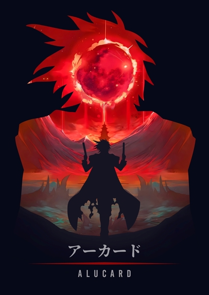 "Alucard Hellsing" poster od Illust Artz. Temná silueta Alucarda s dvěma zbraněmi v ruce se rýsuje proti krvavě rudému slunci, které pulzuje jako srdce noční můry. Minimalistický, ale brutálně výrazný design zachycuje ten moment, kdy fantasy potkává děs – a vy se s tím prostě musíte vypořádat. Krajina je rozbitá, divoká, ideální pro všechny fanoušky manga a anime, kteří milují temné příběhy a nadpřirozené thrillerové vibrace. Tohle není jen obraz, tohle je atmosféra.