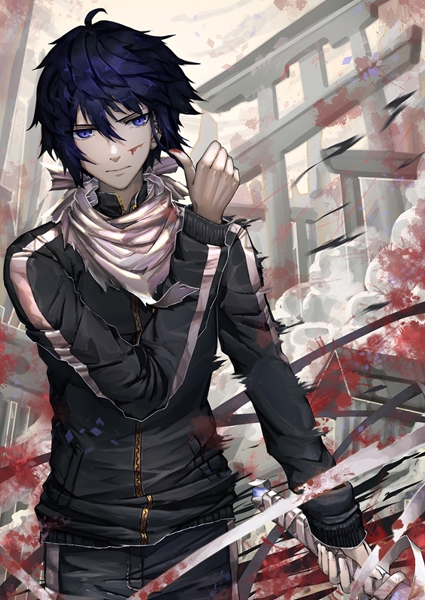 "Yato Noragami" poster od Inspireerida Art. Postava Yata z anime Noragami s temně modrými vlasy a pronikavýma modrýma očima stojí před tradiční japonskou branou torii. Jeho sebejistý úsměv a uvolněný postoj kontrastují s dramatickým pozadím, kde rudé skvrny a rozmazané linie evokují chaos a napětí. Kombinace moderního oblečení a starobylých symbolů vytváří fascinující mix minulosti a přítomnosti. Skvělé pro fanoušky anime i milovníky výrazné digitální grafiky.
