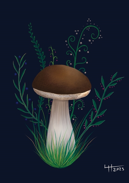 "Houby Sny Houby" poster od Linnea Härjerud. Temně modré pozadí dává prostor jediné hrdince – samostatné hnědé hřibu, která vyrůstá z trsu svěže zelené trávy. Okolo ní se vinou fantaskní větvičky, jako by rostla v tajemném snovém lese, kde příroda hraje svou vlastní hru. Je to ten moment, kdy obyčejná houba najednou není jen houba, ale brána do světa plného fantazie a nočních příběhů. Perfektní kousek pro ty, kdo si chtějí přizvat kousek přírody s dávkou magie do svého interiéru.