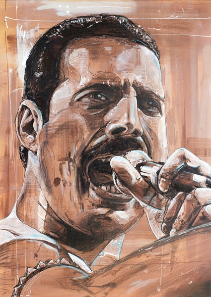 "Freddie Mercury Queen obraz" poster od Johannes. Tahle malba chytí okamžik, kdy Freddie Mercury vládne mikrofonu s neuvěřitelnou energií. Každý tah štětce pulzuje vášní, která z něj přímo srší – od nasazeného výrazu až po pevný stisk mikrofonu. Barvy hrají na zemité tóny, které kontrastují s výraznou expresí, takže to není jen portrét, ale skoro vizuální koncert. Ideální kousek pro všechny, kdo chtějí mít doma kousek rockové historie na zdi.
